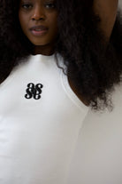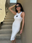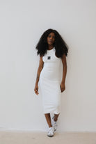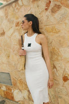 Przód sukienki zdobi charakterystyczny haft z logo marki w formie 3d.