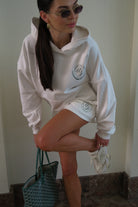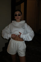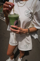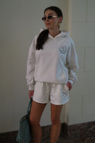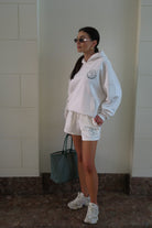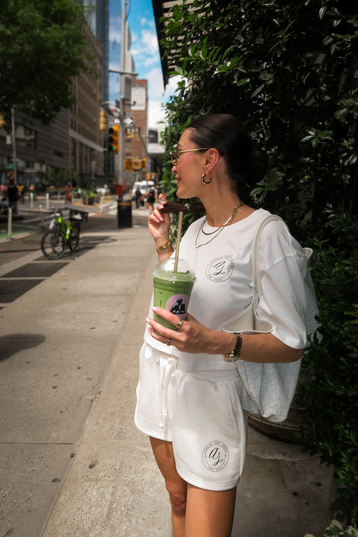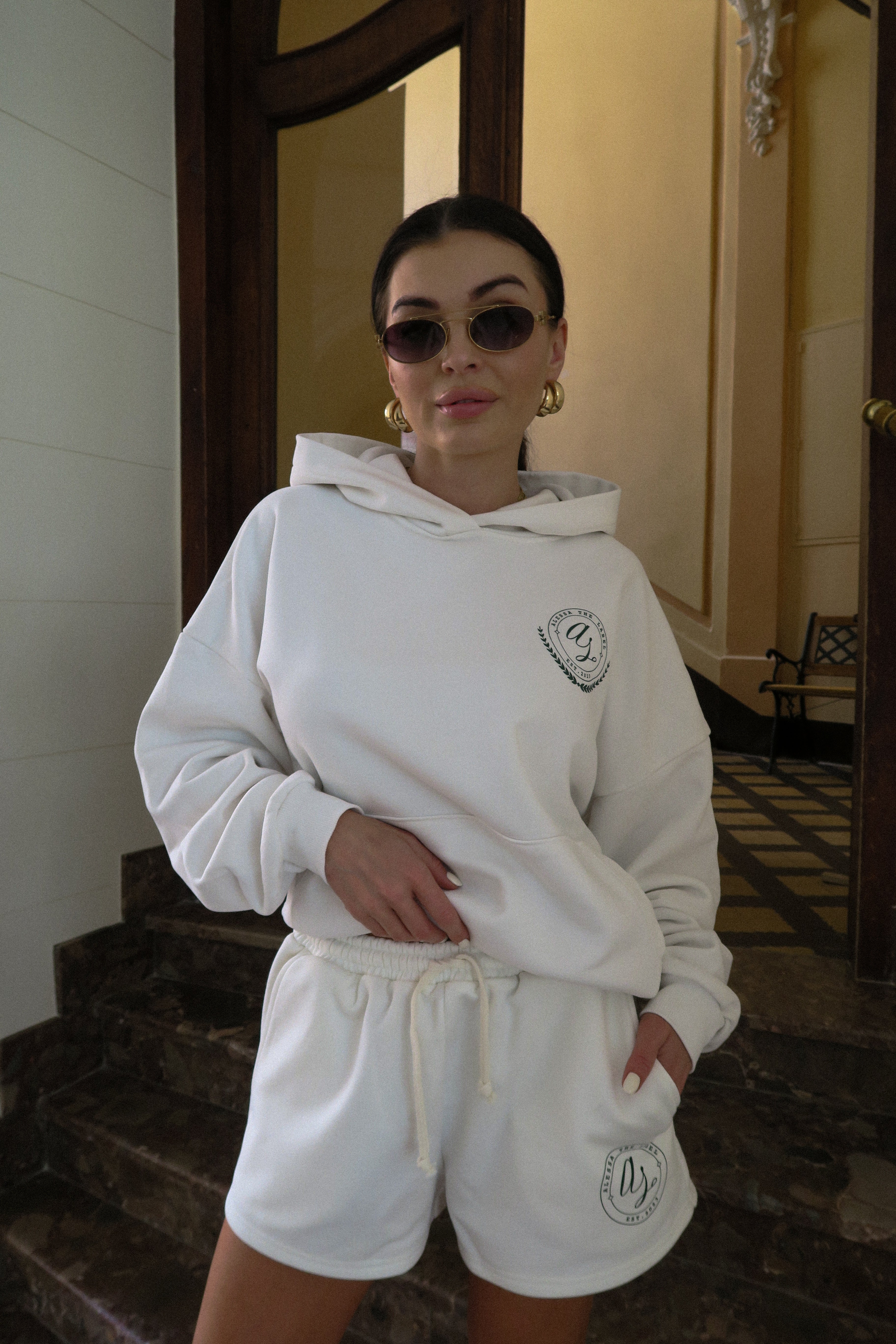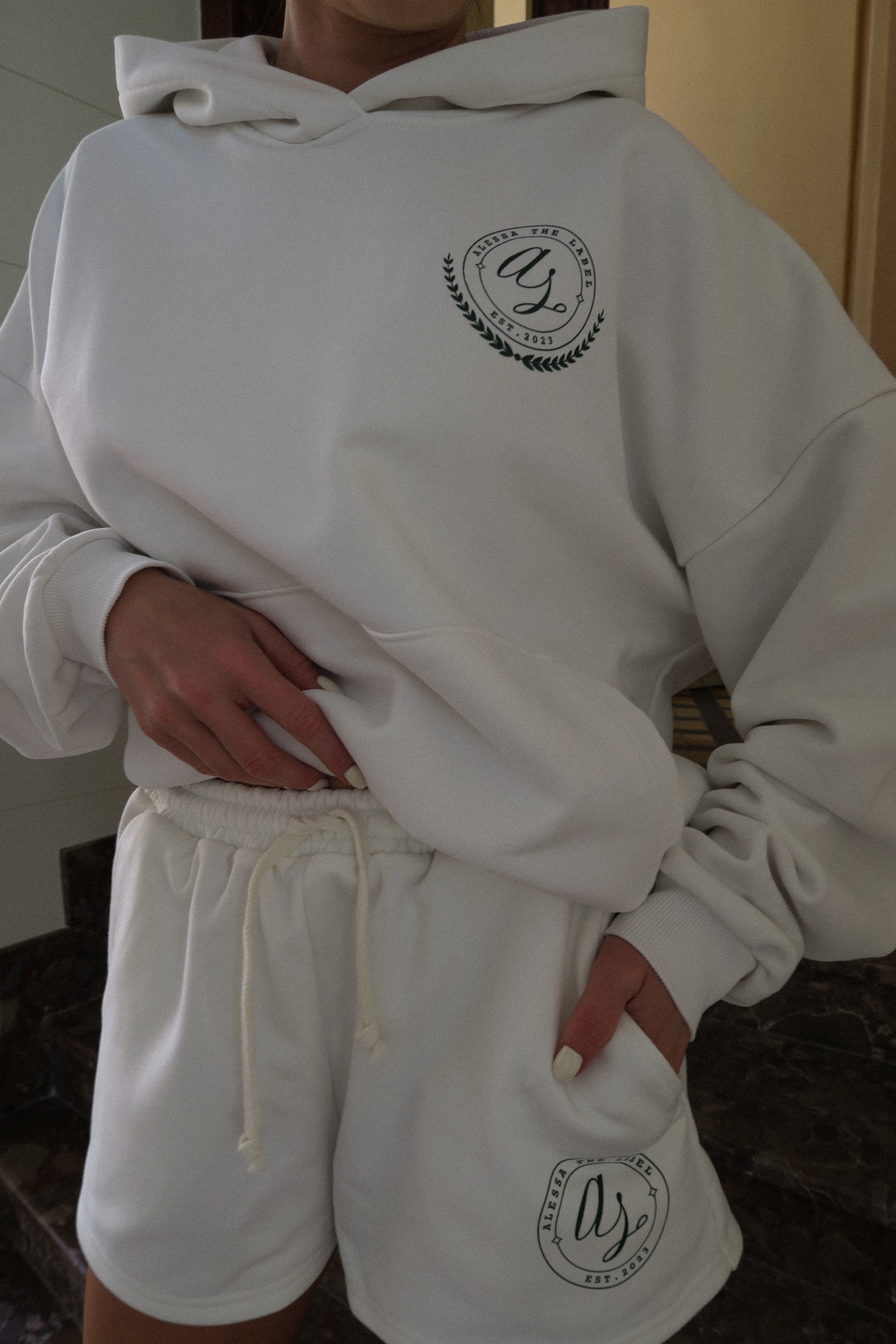 Uszyte z miękkiej bawełny dresowej w kolorze czystej bieli, zostały wykończone haftowanym logo Alessa w odcieniu royal green, który nawiązuje do całej kapsuły.