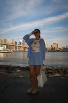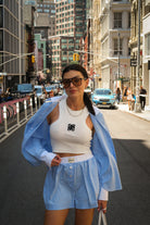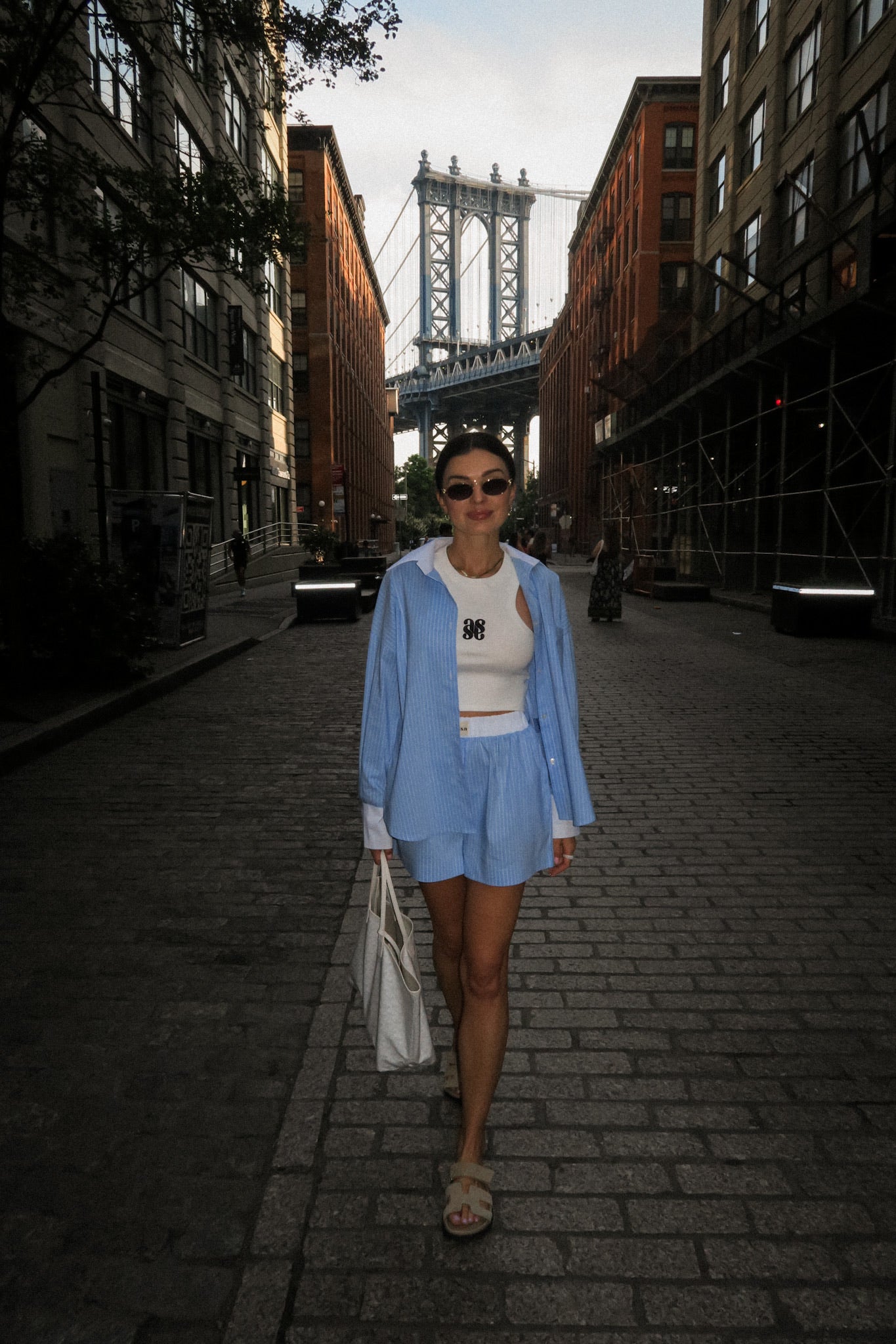 Szorty NEW YORK Blue to komfort i styl w jednym. Błękitne paski kojarzą się z letnim niebem, a gumka w pasie i guziki z przodu sprawiają, że są nie tylko wygodne, ale i efektowne. Noś z białym topem lub połącz z koszulą NEW YORK – to set stworzony na nowojorskie ulice.