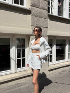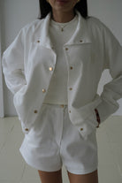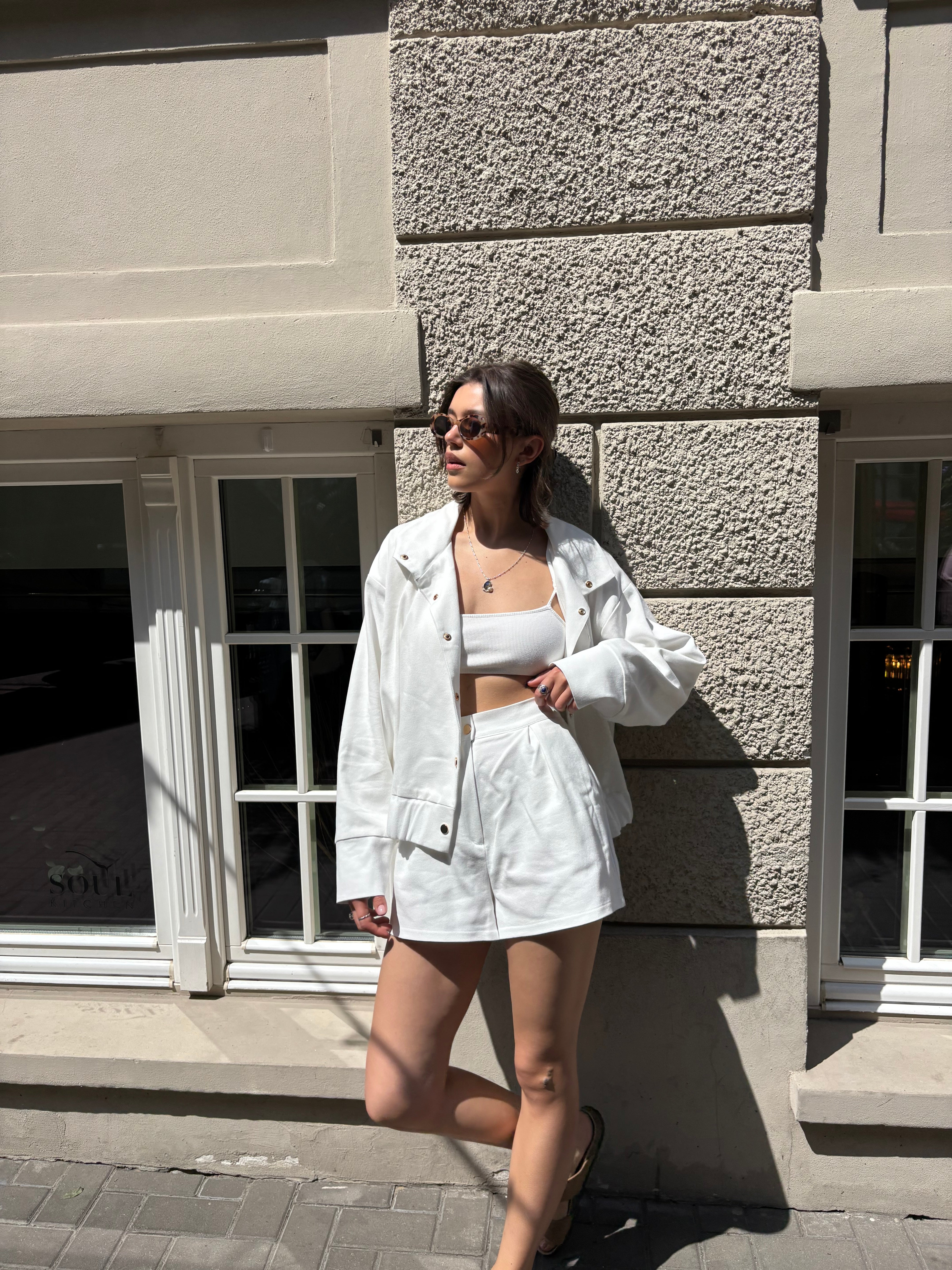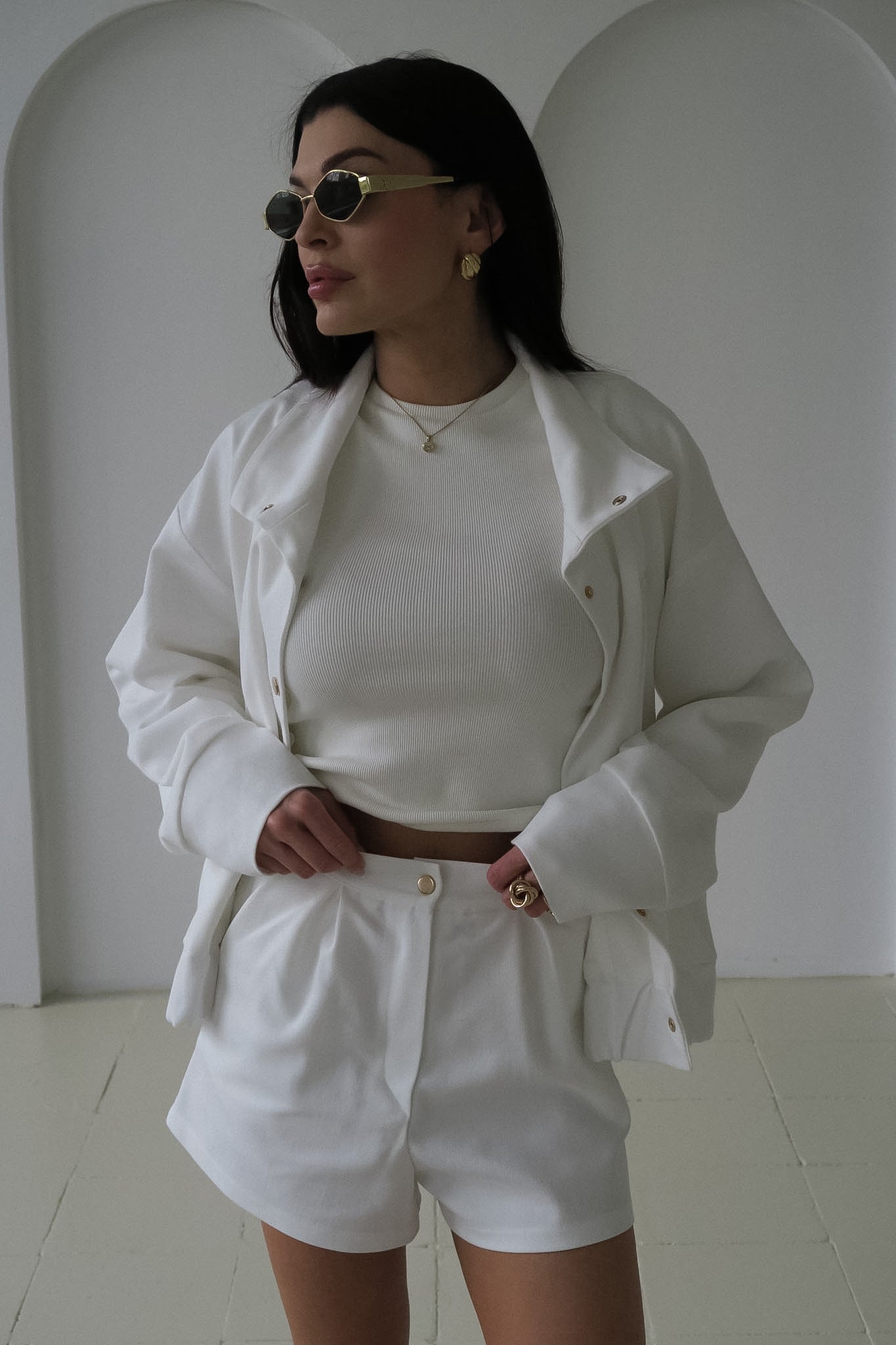 Szorty Porto Off White to lekka i ponadczasowa baza w szafie – klasyka w wydaniu cool & comfy. Uszyte z cienkiego, oddychającego materiału o delikatnej strukturze, zapewniają komfort i świetne dopasowanie. Wysoki stan i subtelne zakładki z przodu pięknie podkreślają talię i nadają całości kobiecego, ale swobodnego charakteru.
