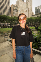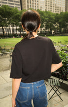 Czarny T-shirt o lekko skróconym fasonie. Krótki rękaw, bawełna premium, kontrastowy haft z przodu. Uniwersalny i wygodny – do noszenia na co dzień i na podróże. Idealny do każdego dołu z szafy.
