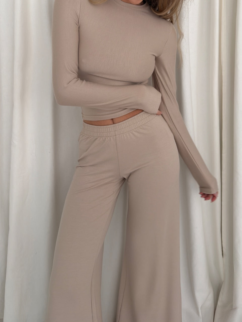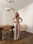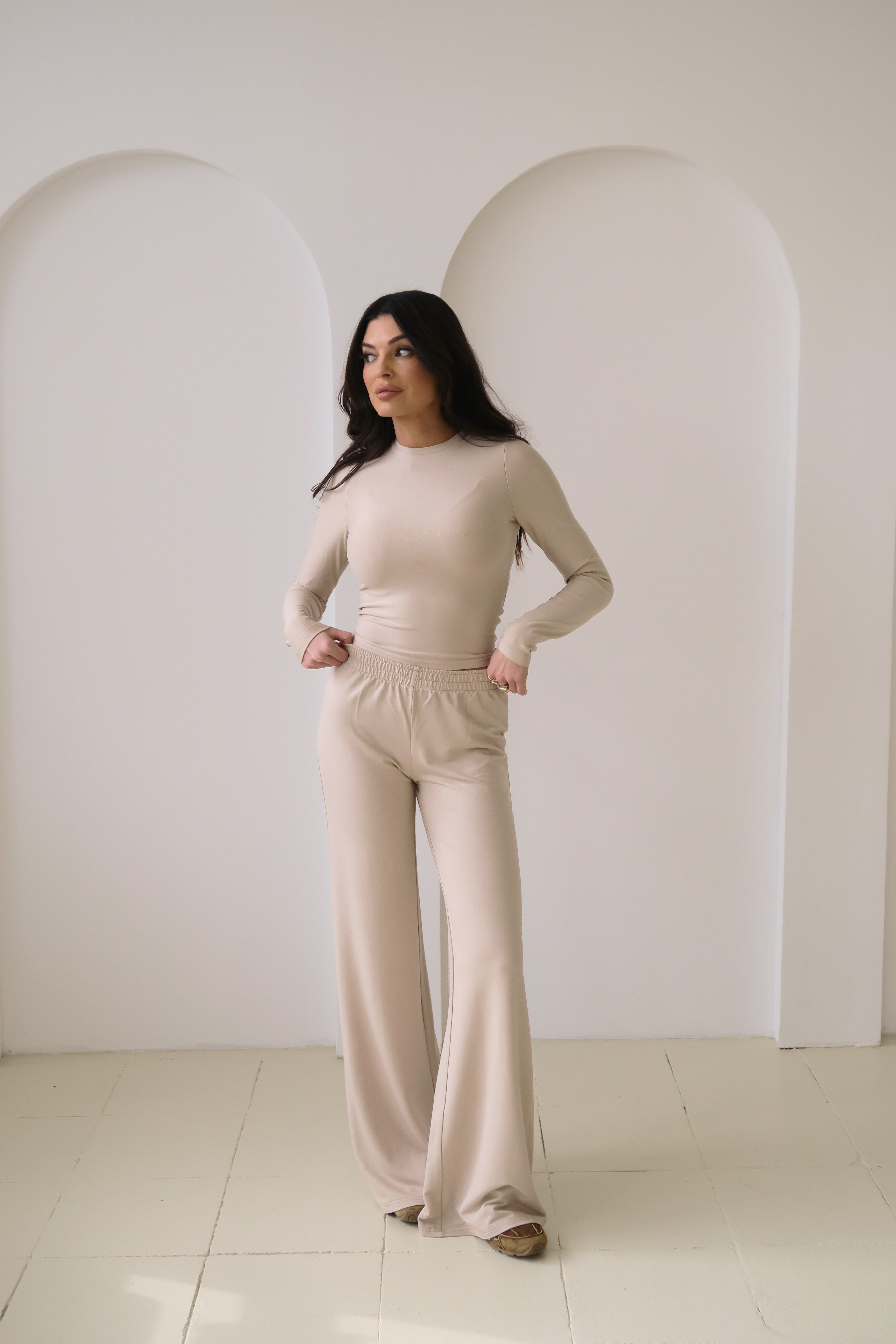 Legginsy Flare Sand to połączenie wygody legginsów z elegancją rozszerzanej nogawki. Uszyte z miękkiego, lejącego modalu, który idealnie dopasowuje się do sylwetki, podkreślając jej naturalną linię i zapewniając komfort przez cały dzień.