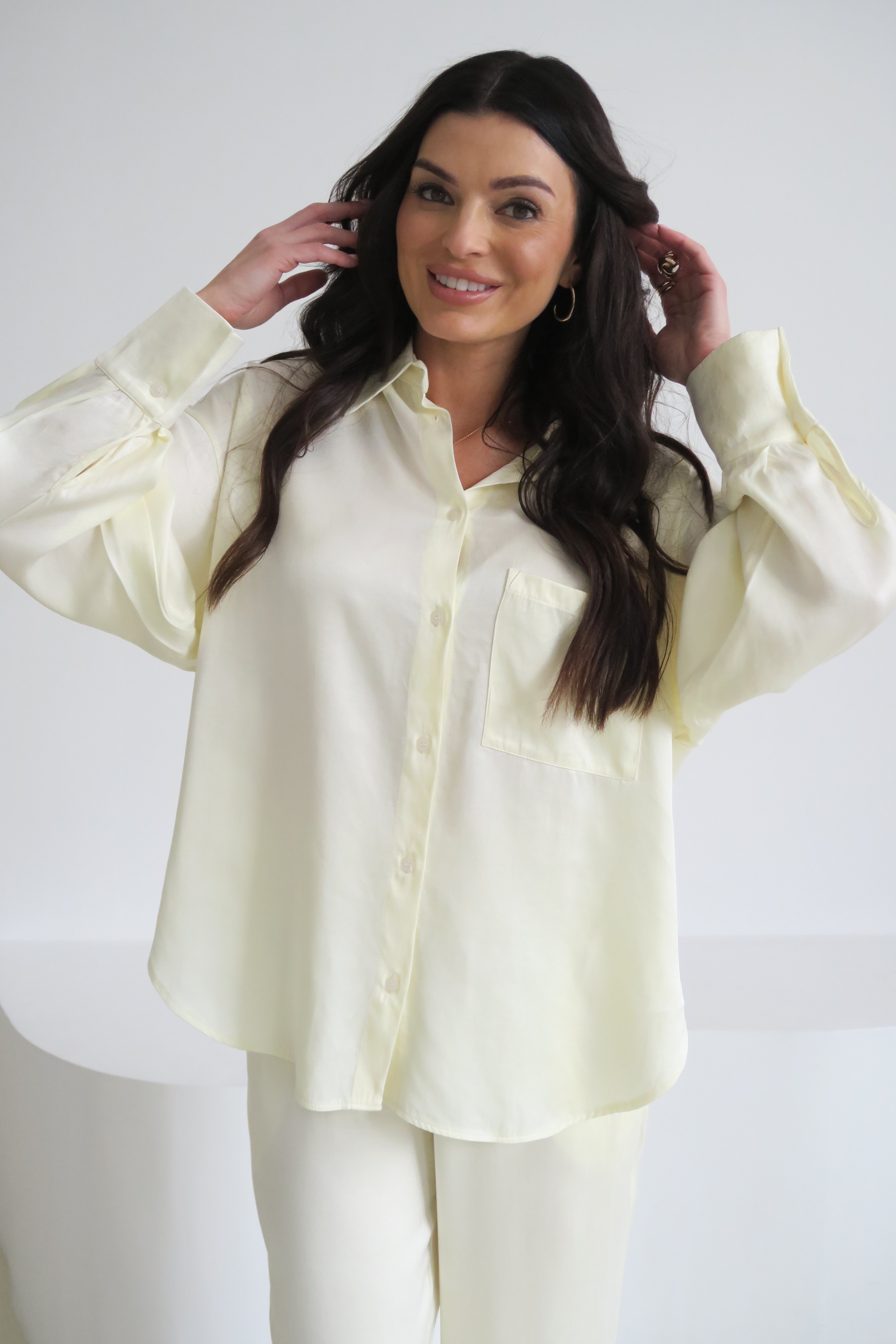 Oversize’owy fason w połączeniu z klasycznym kołnierzykiem i zapięciem na guziki tworzy balans między nowoczesnym luzem a elegancją. Delikatny połysk tkaniny subtelnie odbija światło – idealnie sprawdzi się podczas wieczornych wyjść i uroczystości.