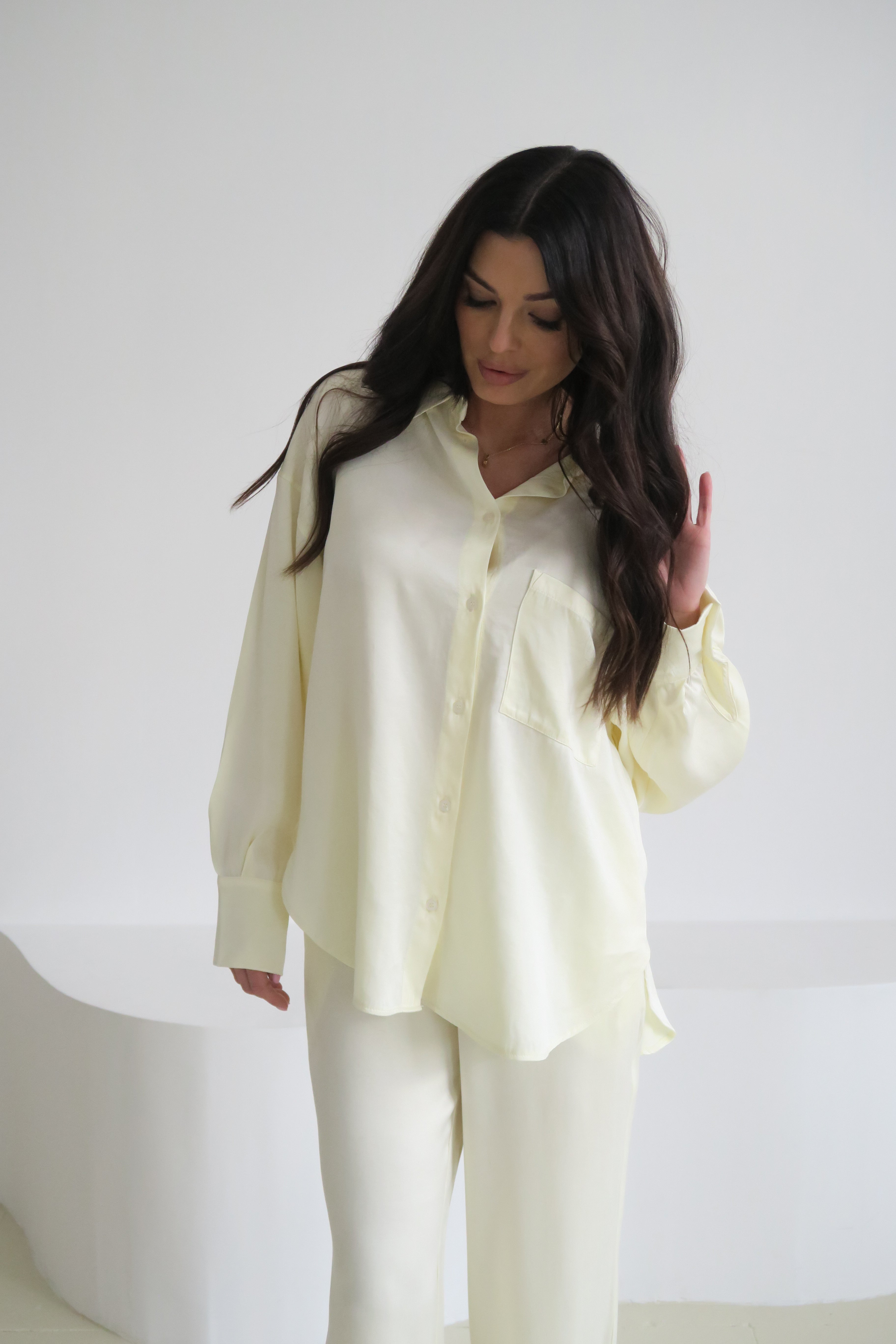 Wykonana z lejącej mieszanki lyocellu i wiskozy o subtelnie połyskującej powierzchni. Materiał jest miękki, szlachetny w dotyku i ma wyczuwalną, elegancką ciężkość – pięknie opada, trzyma linię i nadaje sylwetce bardziej wyrafinowany charakter.