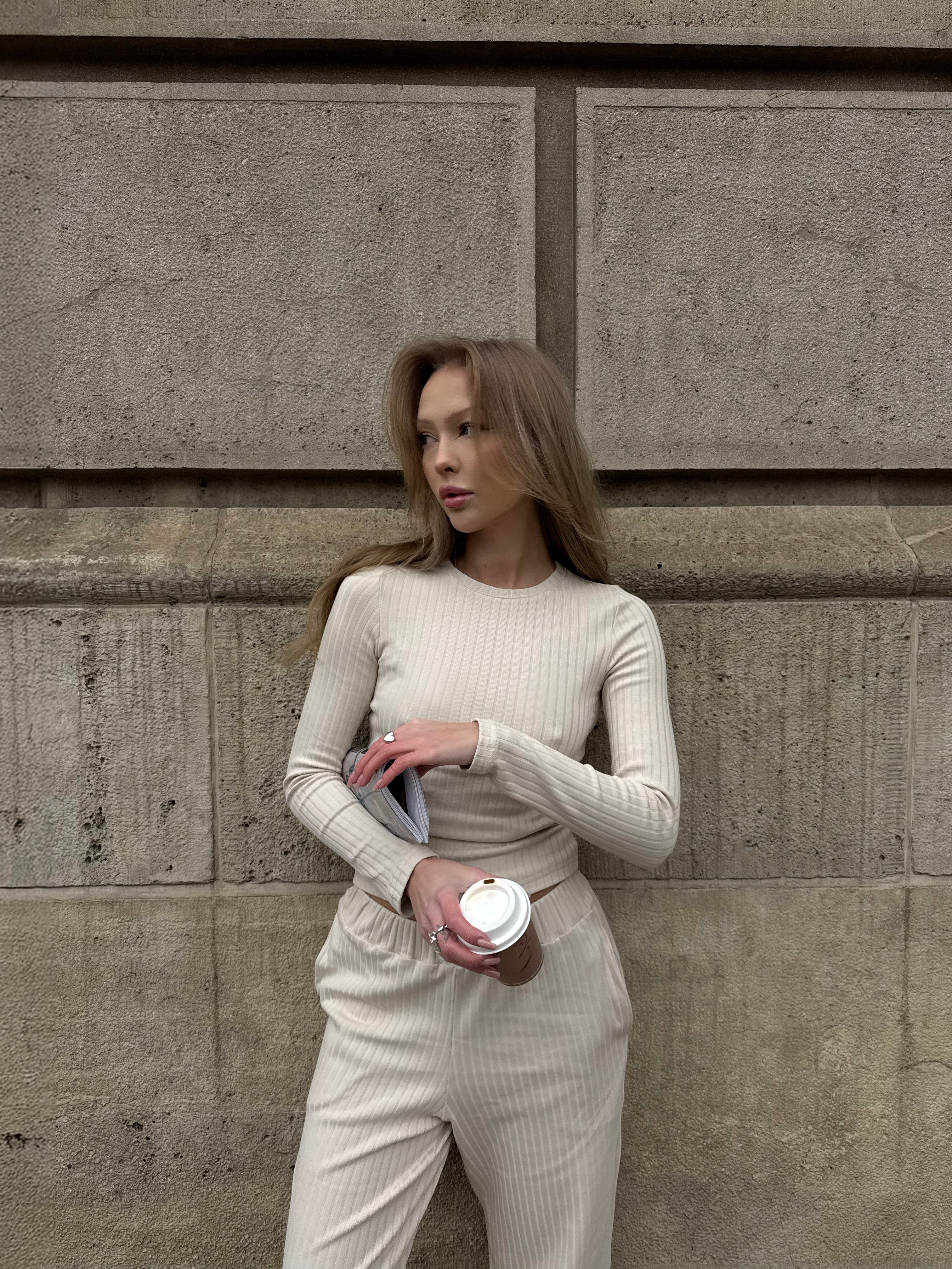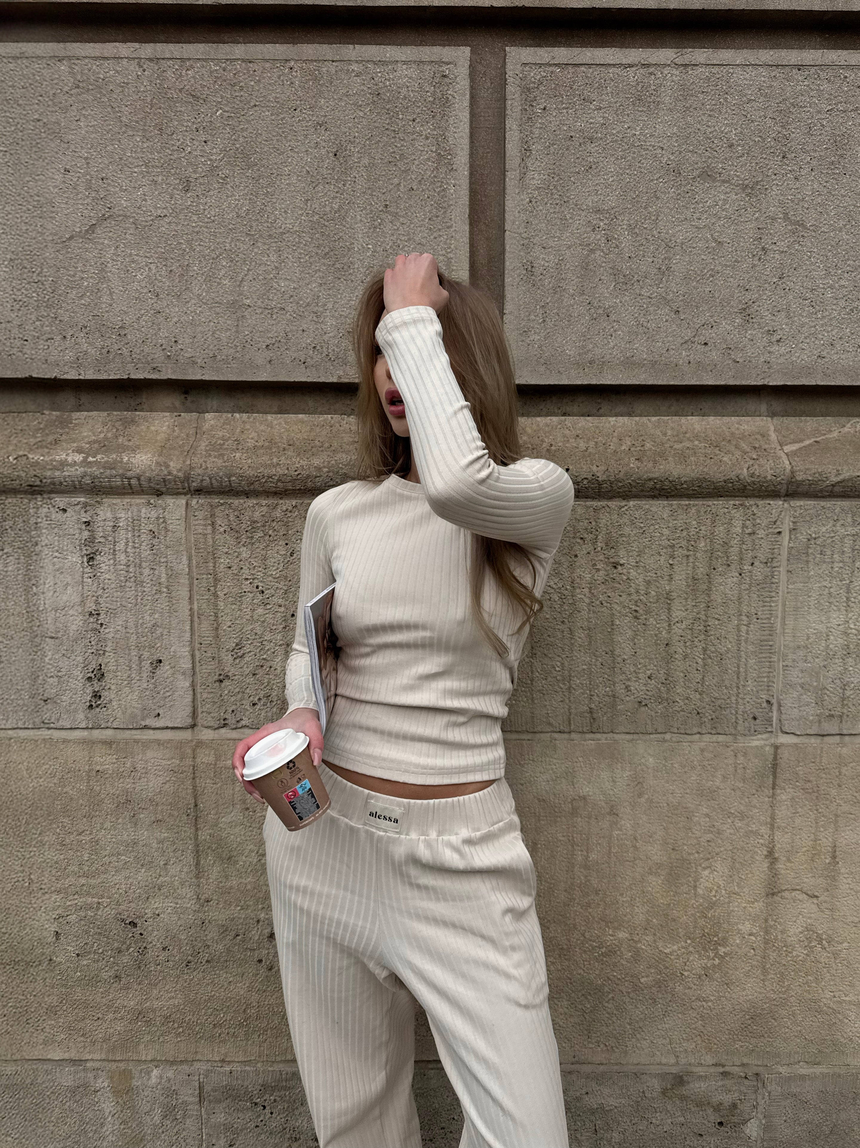 Uszyty z bawełnianego, szerszego prążka z dodatkiem 5% elastanu. To naturalna, oddychająca dzianina o wyraźnej strukturze, która pięknie układa się na ciele i trzyma formę przez cały dzień. Materiał jest miękki w dotyku, elastyczny i komfortowy – nie krępuje ruchów, nie uciska, pracuje razem z Tobą.