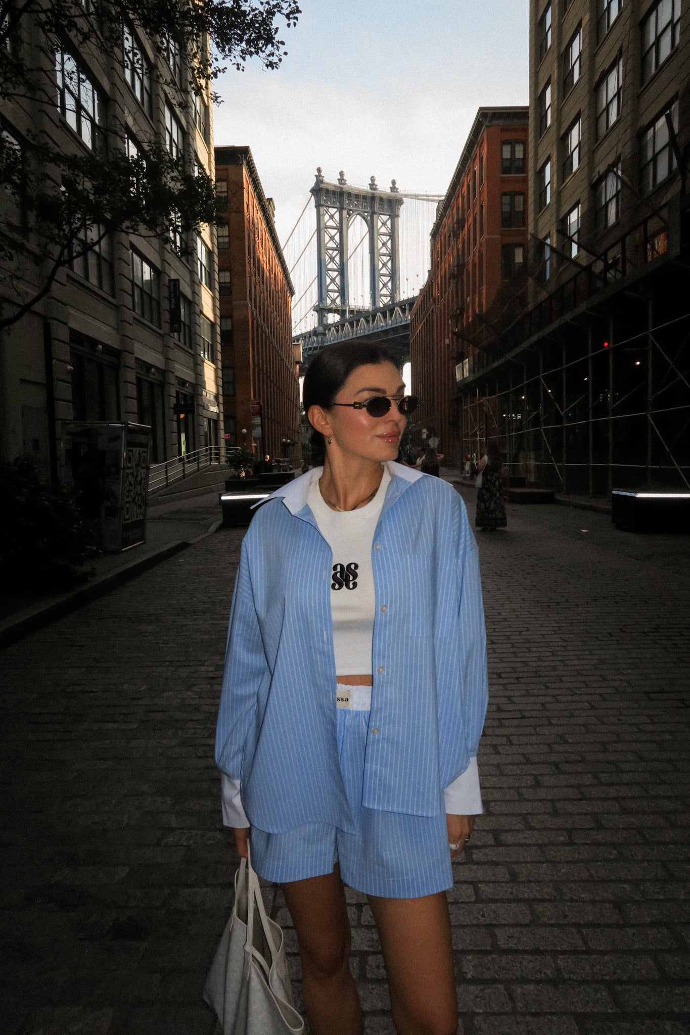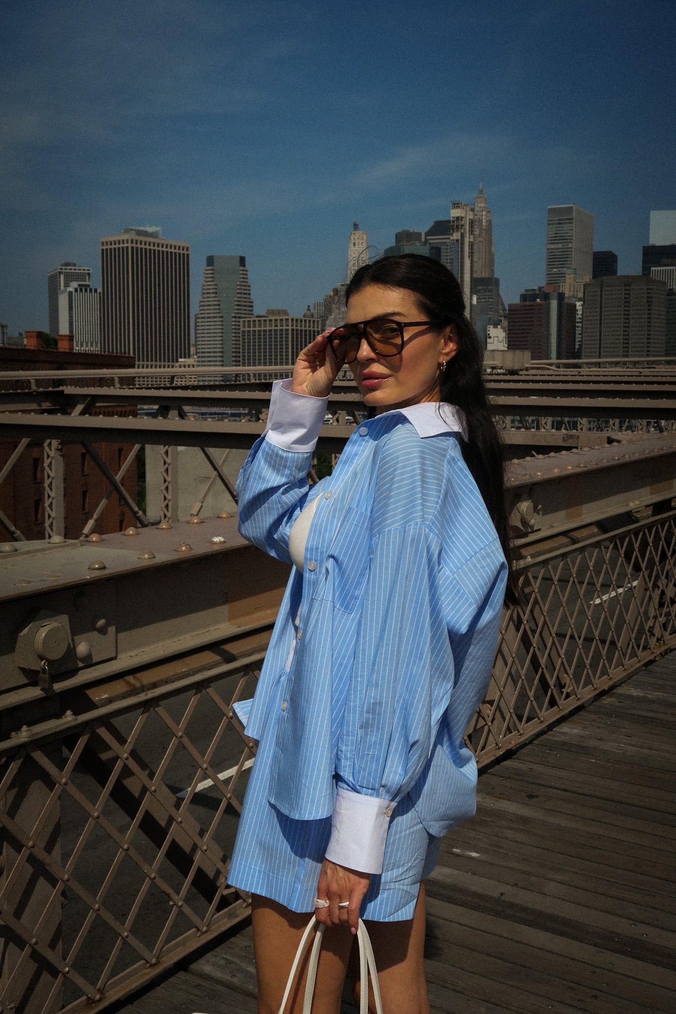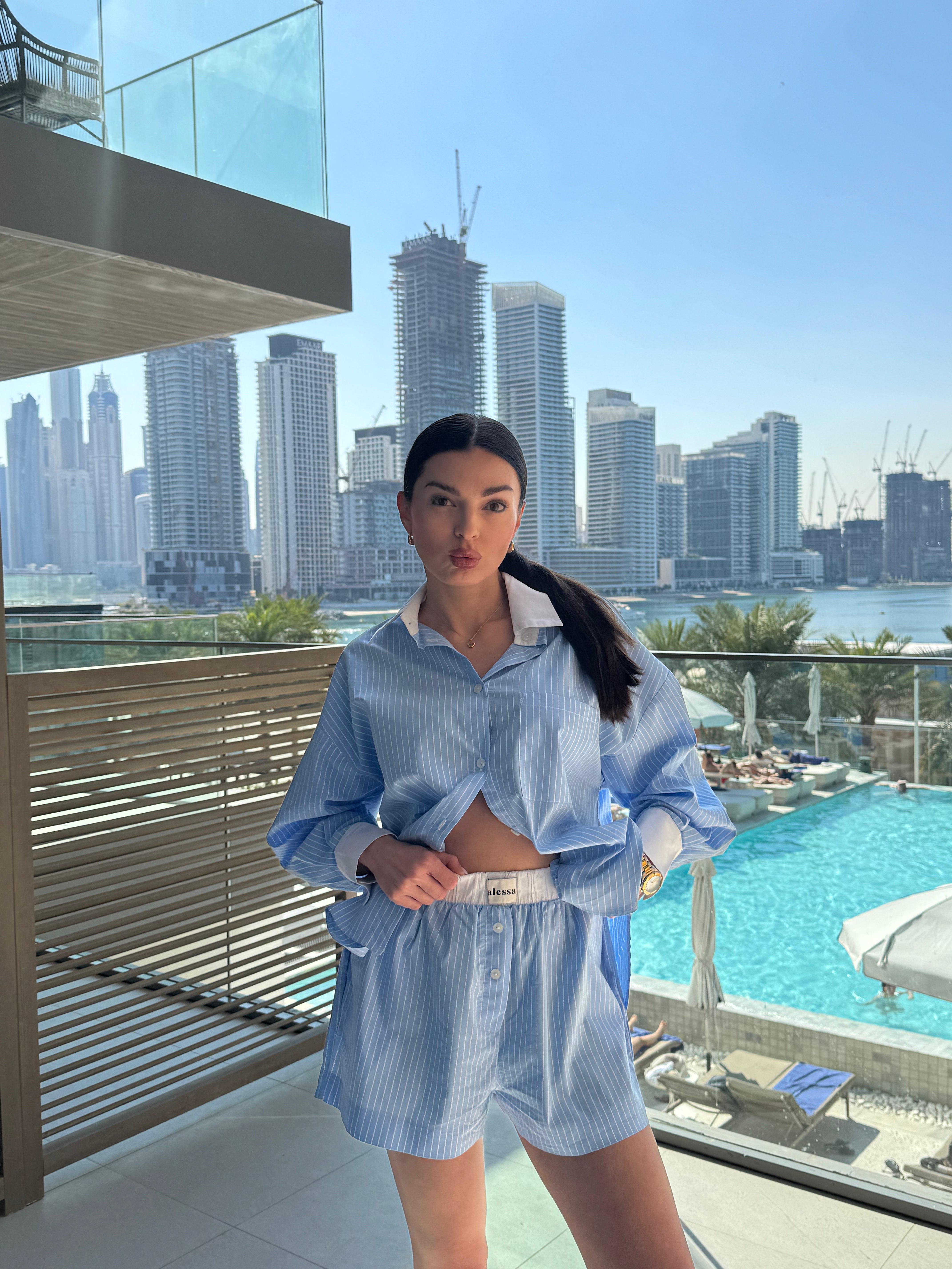 Koszula NEW YORK Blue to ukłon w stronę klasyki z nowojorskim twistem. Błękitne paski i oversize’owy fason nadają jej luzu, a biały kontrastowy kołnierz i mankiety to modowy smaczek. Latem tworzy komplet idealny z szortami, ale sprawdzi się też przez cały rok – z jeansami albo legginsami i topem Luna w stylu pilates princess. Jeden zakup, wiele możliwości.