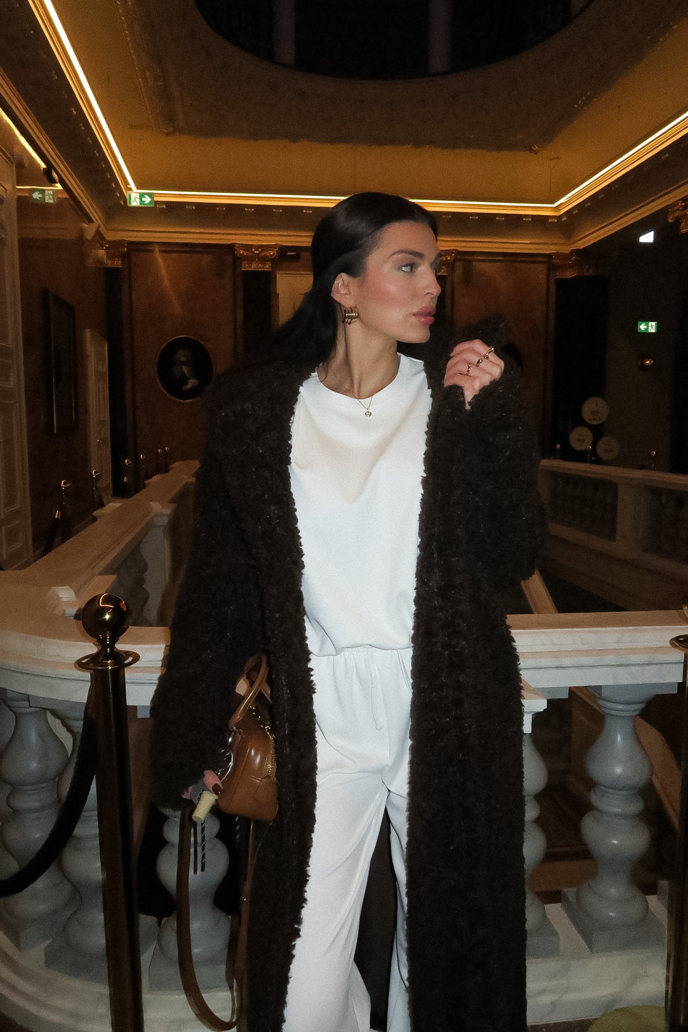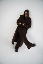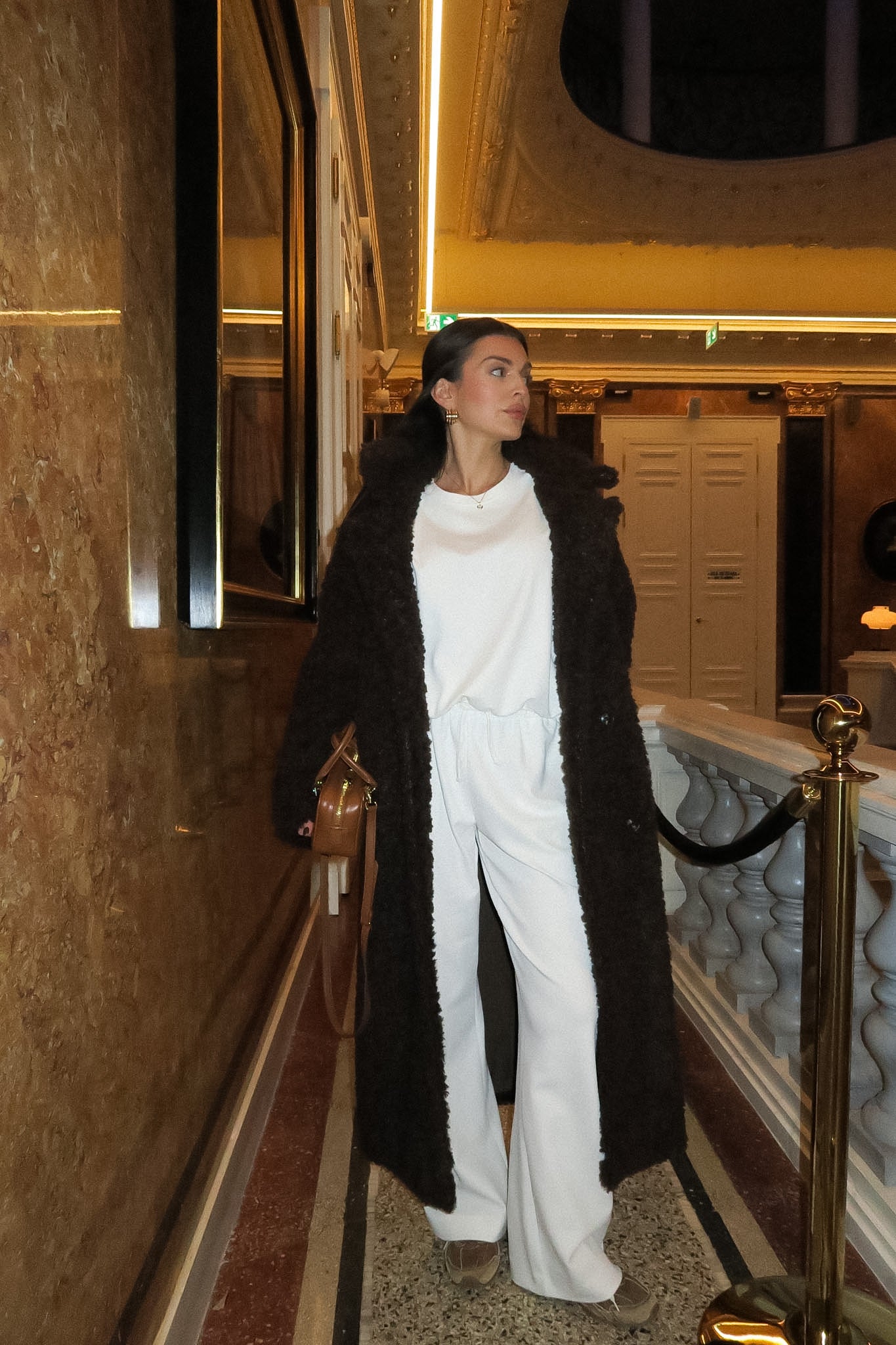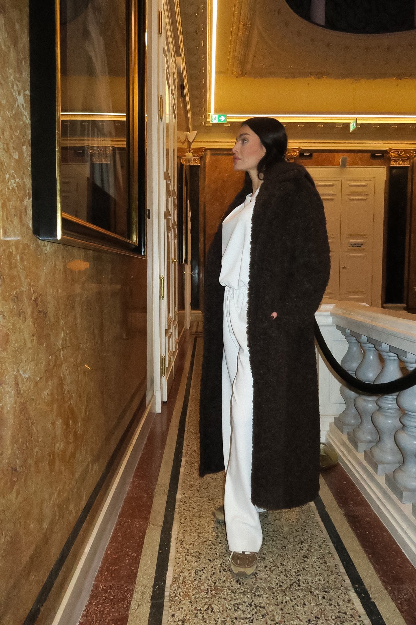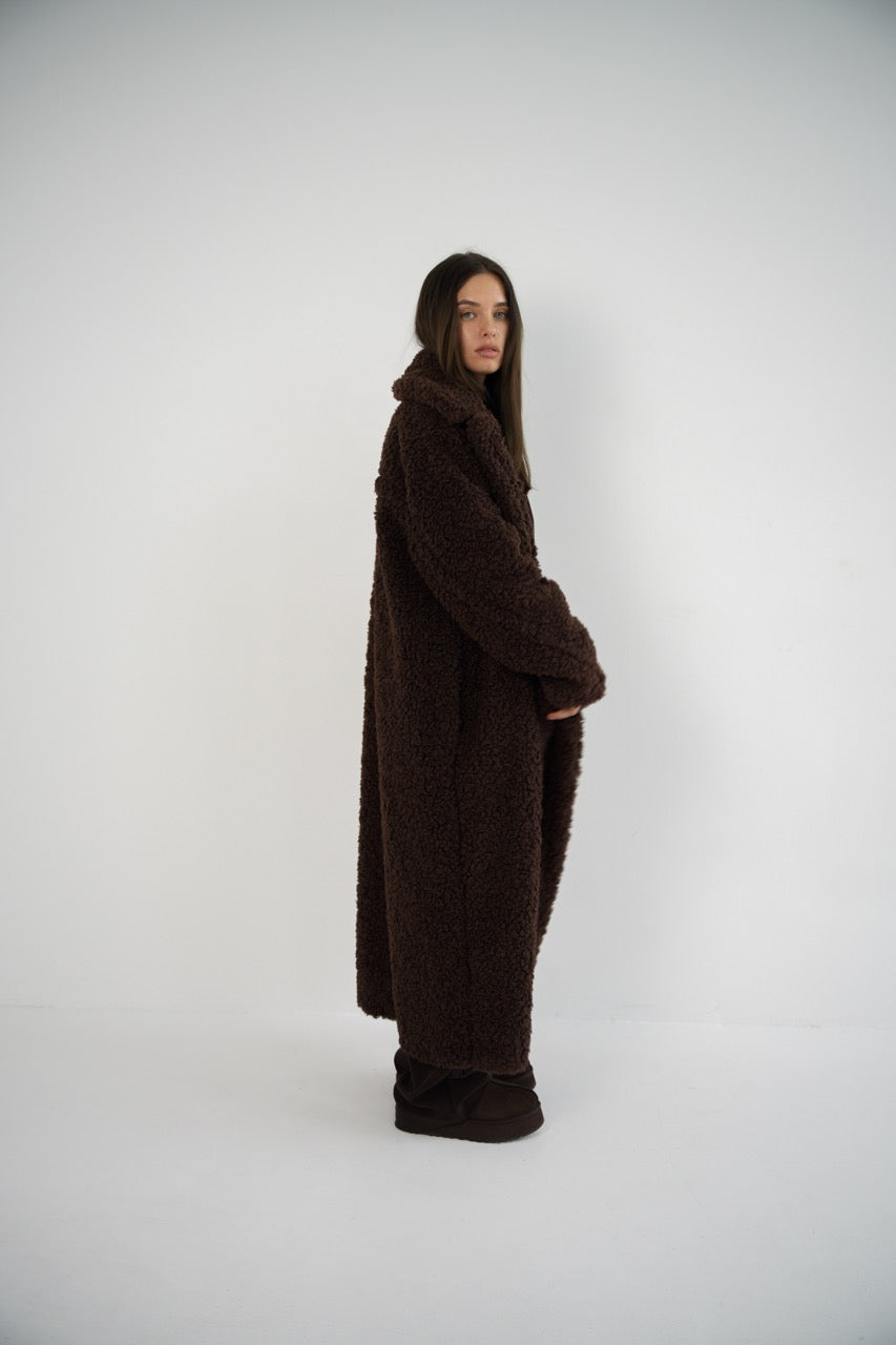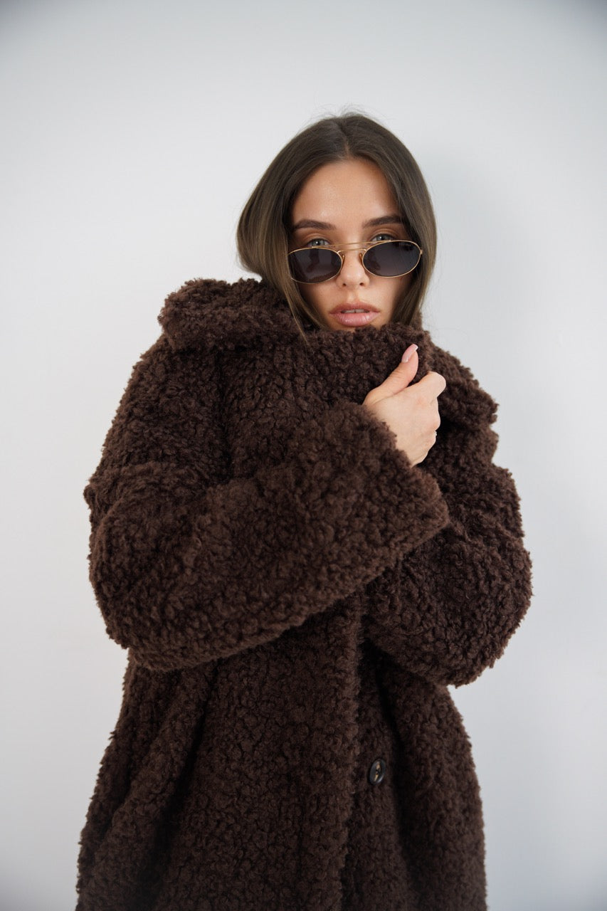 Miękki, ciepły i bardzo elegancki. Teddy Chocco to limitowany płaszcz o oversizowym kroju, uszyty z premium tkaniny z aż 50% wełny. Ma piękny, głęboki czekoladowy kolor i klasyczne zapięcie na guziki. Otula jak teddy, ale wygląda jak luksusowy winter coat. Idealny na zimowe stylizacje, grudniowe wyjścia i codzienny cool & cozy look.