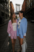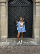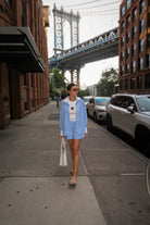Koszula NEW YORK Blue to ukłon w stronę klasyki z nowojorskim twistem. Błękitne paski i oversize’owy fason nadają jej luzu, a biały kontrastowy kołnierz i mankiety to modowy smaczek. Latem tworzy komplet idealny z szortami, ale sprawdzi się też przez cały rok – z jeansami albo legginsami i topem Luna w stylu pilates princess. Jeden zakup, wiele możliwości.